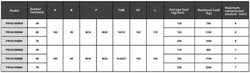 Амортизаторы серии в форме колокольчика FRHQ могут достигать очень высоких эффектов амортизации при осевом давлении и боковом давлении, особенно при использовании в системах двигателя, эффект амортизации очень очевиден. Резиновые и железные детали внутри изделия полностью приклеены. Кроме того, продукт, который очень надежный и долговечный. Кроме того, на металлической крышке есть канавки, которые помогают удалить масло и другие загрязняющие вещества и предотвратить контакт с резиновой частью. Посередине есть предохранительный замок для блокировки